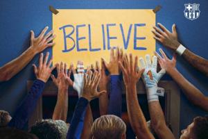 赛前,巴萨官方社媒,晒出全员用手触碰“相信”标语的海报,借用了美剧《足球教练》中的梗。